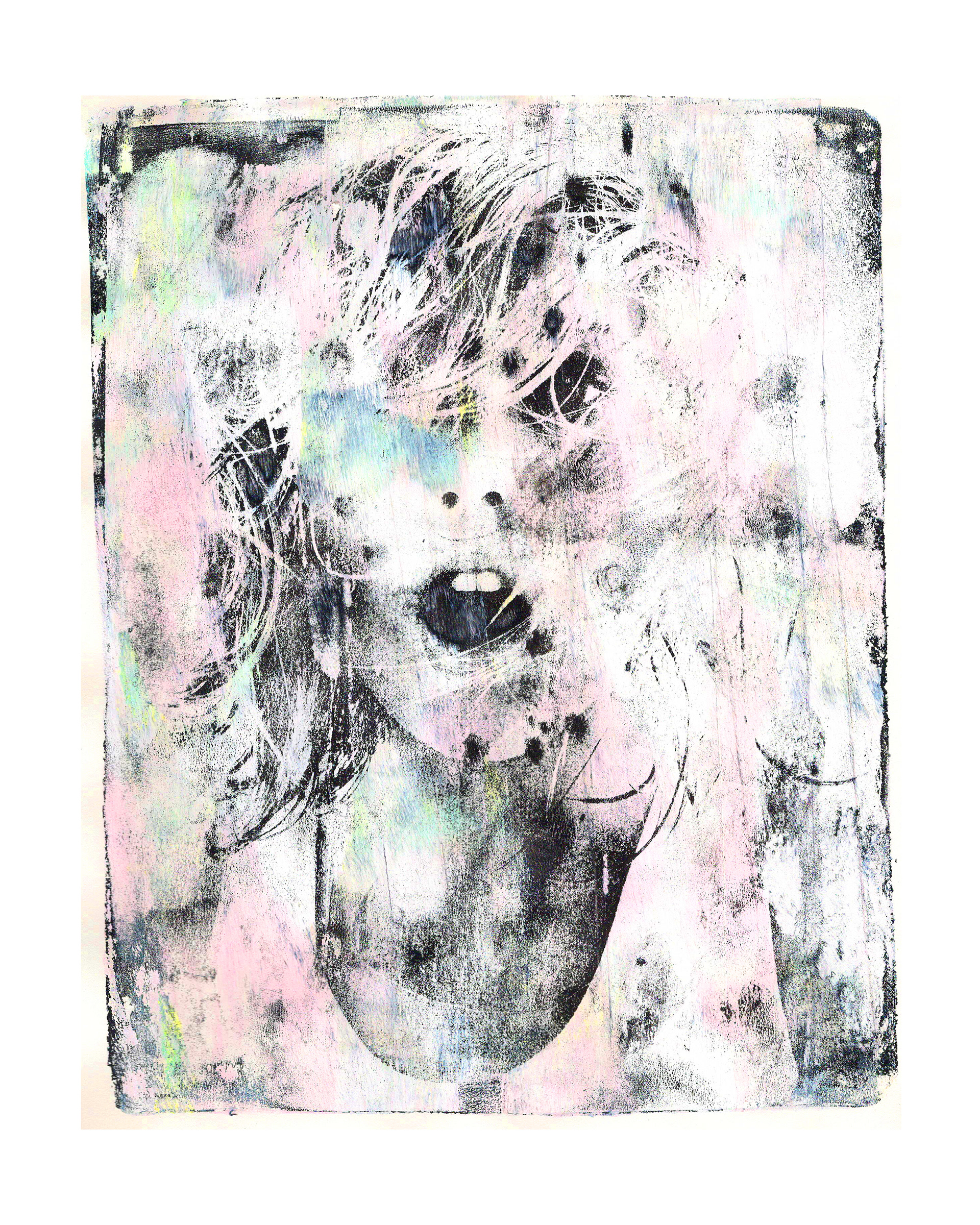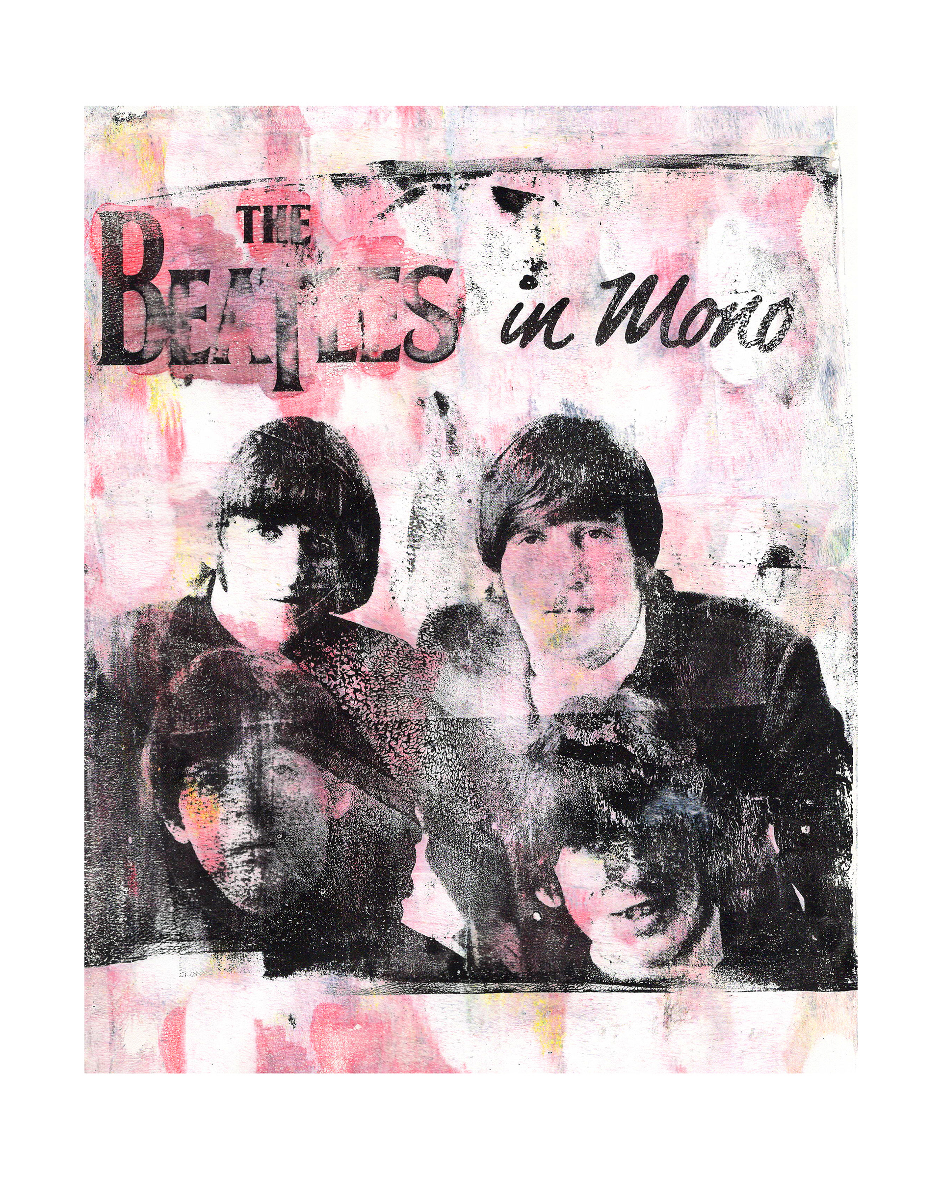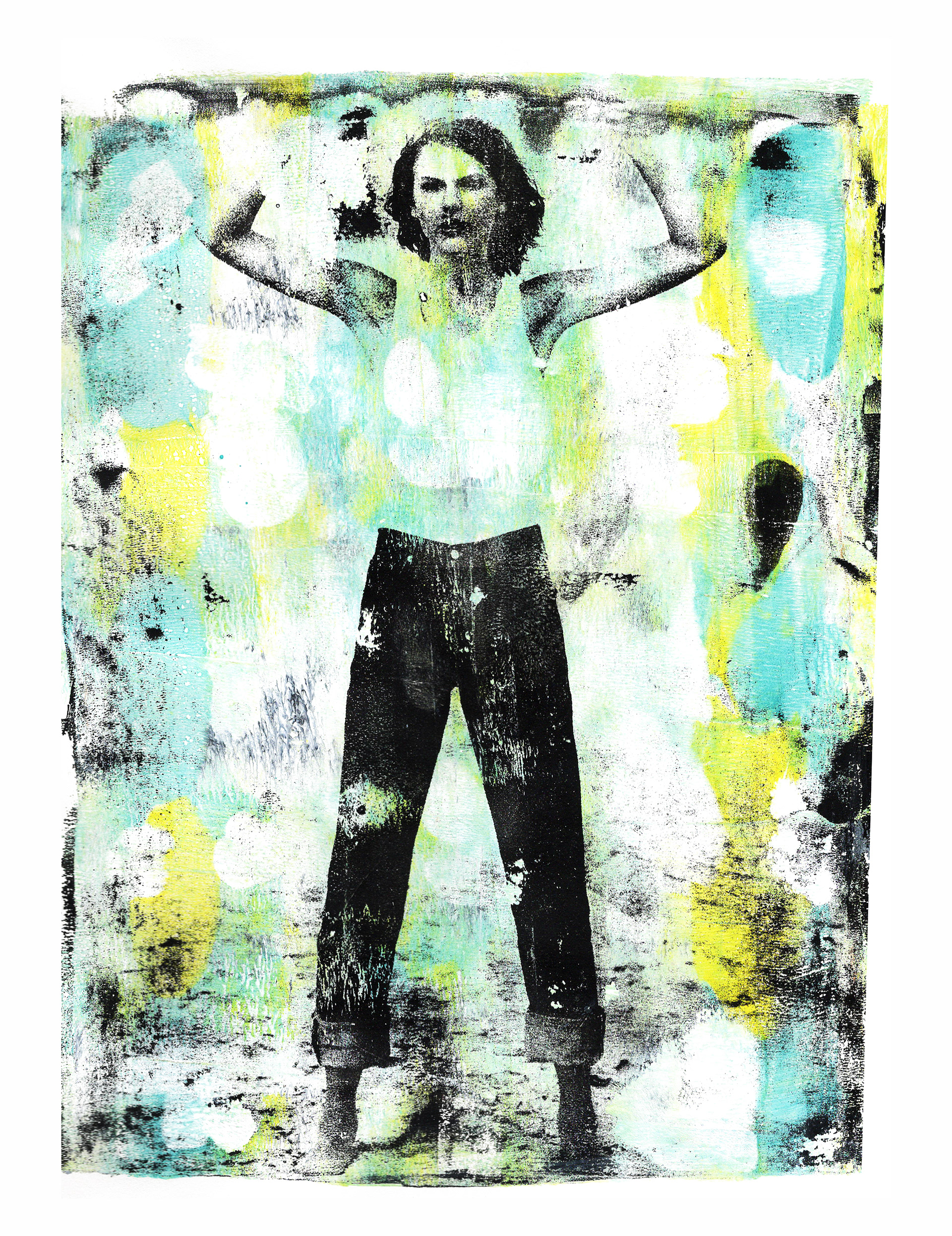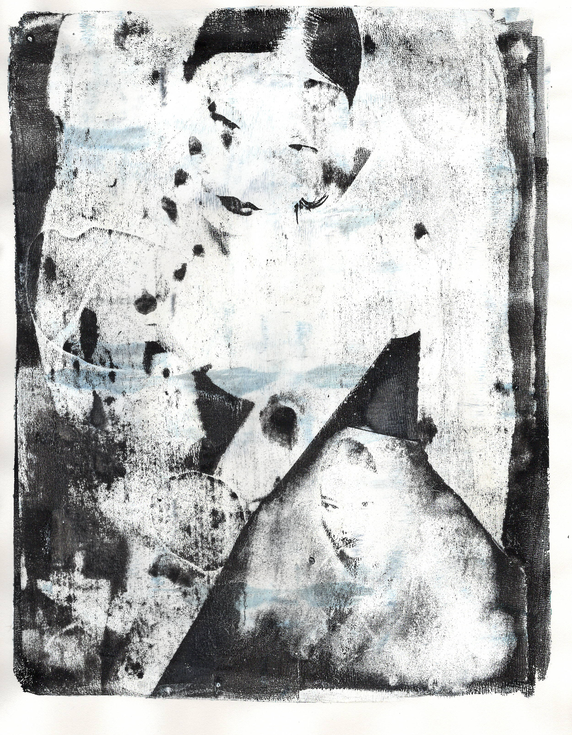 Mono prints, created using collage and acrylic paint with a gel plate printmaking process.