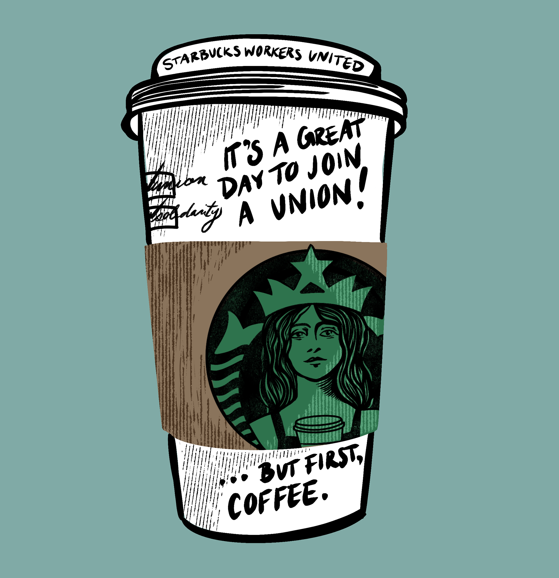 Starting in 2022, Starbucks coffee workers around the country began to unionize under the banner of Starbucks Workers United. In spring of this year, I, as a barista, worked with my cafe to unionize our store, and began to do illustrative work for the nationwide campaign, which culminated in a day-long festival in Richmond Virginia, featuring various musical acts and political speakers including Senator Bernie Sanders. The unionization effort is currently ongoing, with first contract bargaining underway, where I am proud to represent as a bargaining unit delegate.